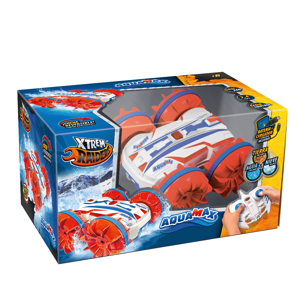 ¡Coche Radio Control anfibio y reversible! Pilota por tierra, nieve e incluso por el agua! Realiza giros 360º.