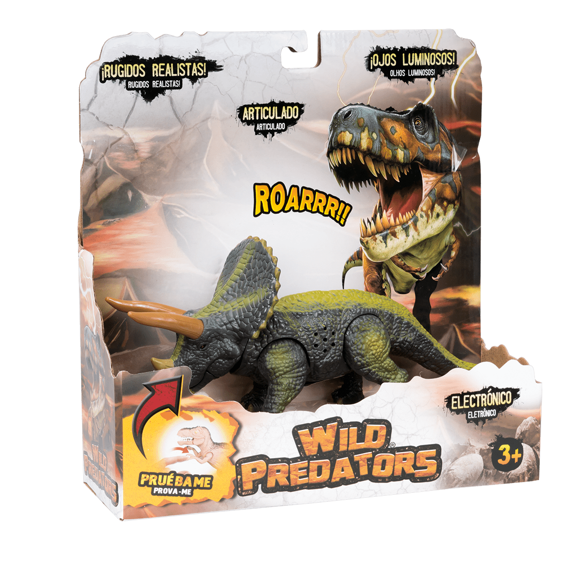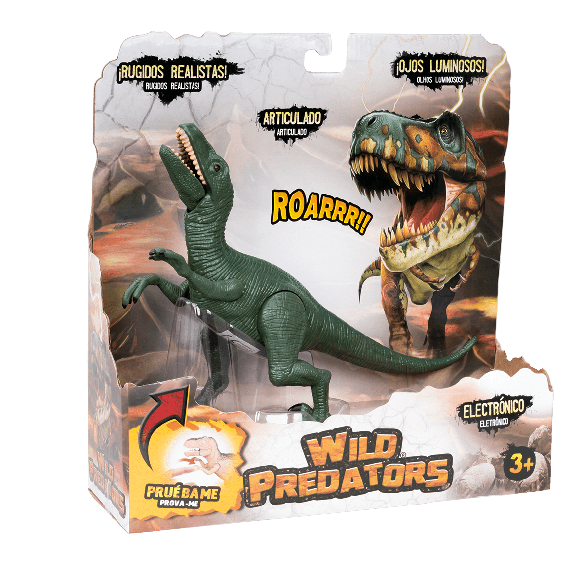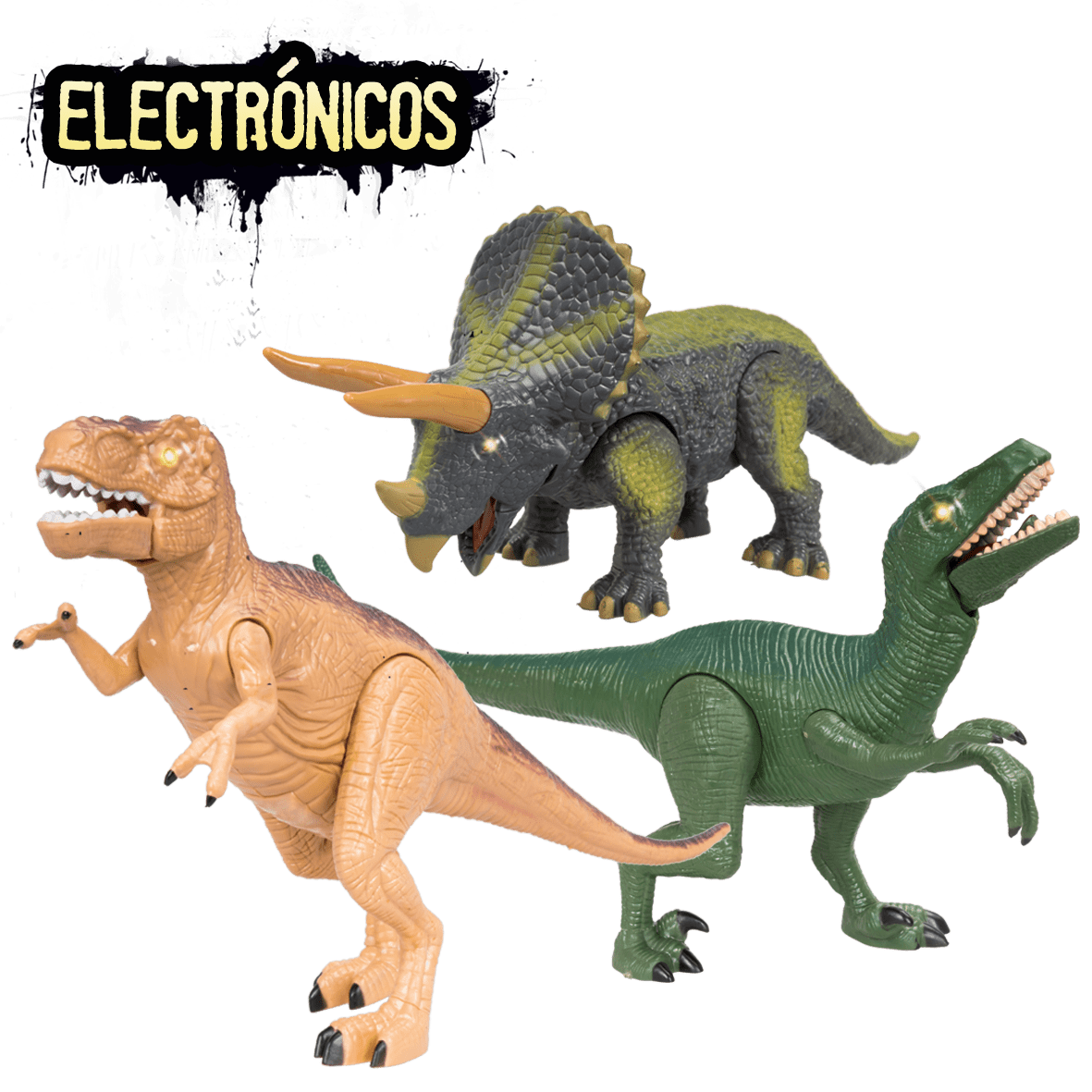 ¡Increíbles dinosaurios con rugidos realistas! Presiónale la mandíbula para escucharlos. Tres modelos: Tyrannosaurus Rex, Triceratops y Velociraptor. Sus ojos se iluminan. Dinosaurios articulados.